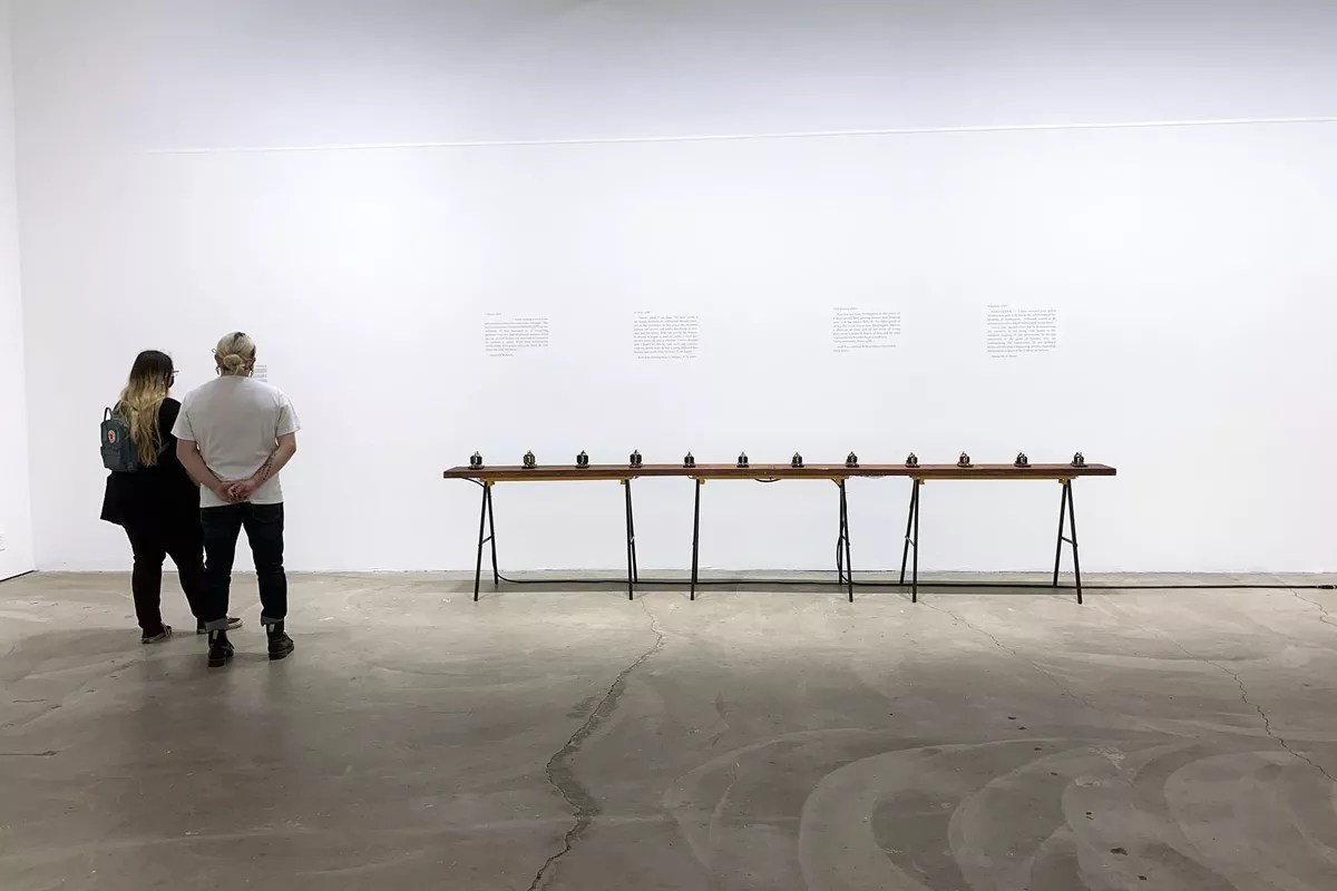 The installation features a couple of long, narrow tables, each with evenly-spaced telegraph receivers periodically tapping out messages. Quotes from the writings of Morse and Fox are fixed to the wall above each machine, translating the taps for visitors.
