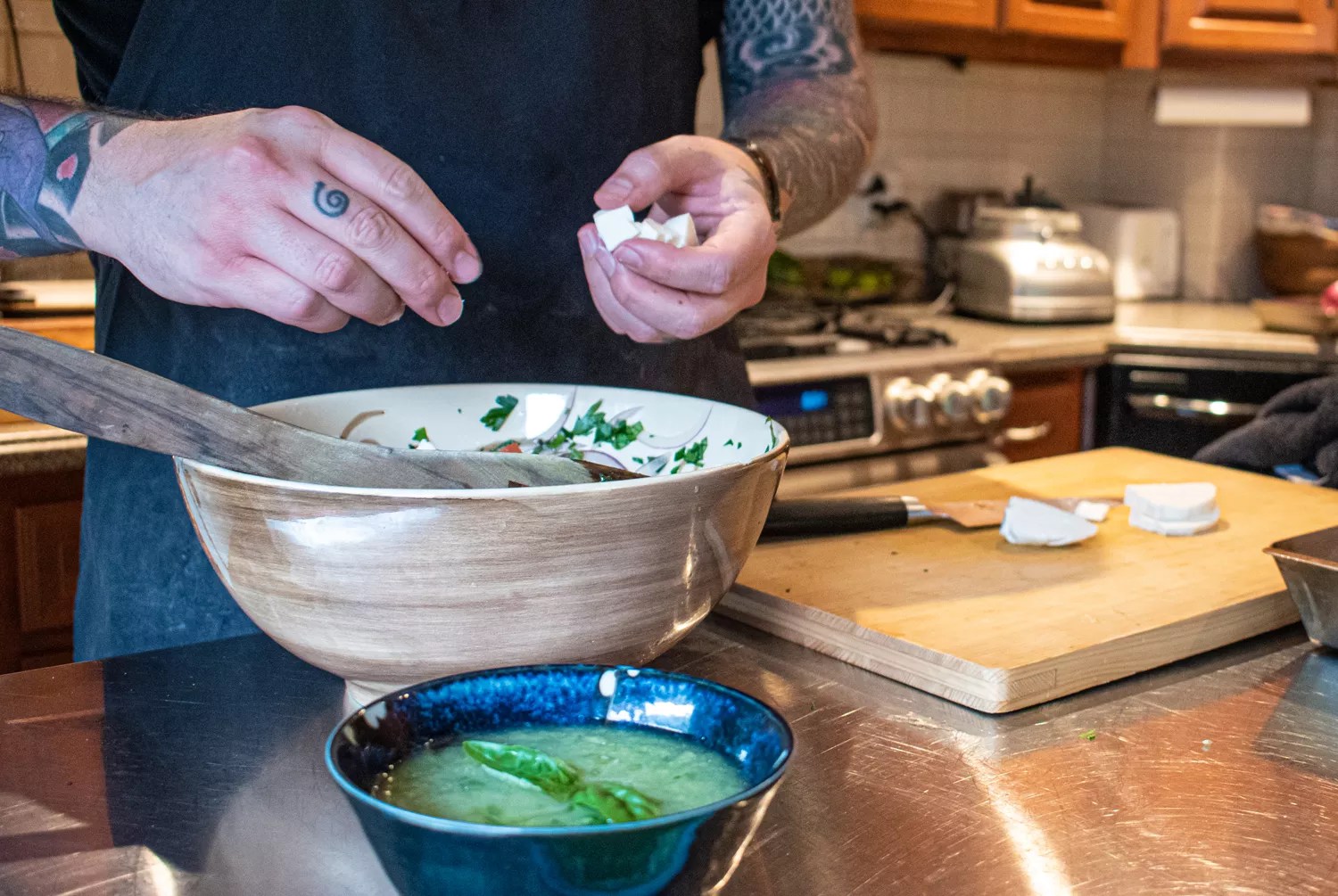 This salad, if you can call it that, is a cross between an Italian version of salsa and a chunky Gazpacho soup. Sometimes it’s eaten with fresh, crusty Italian bread for dipping, while in other versions it’s served with bread cubes mixed into the salad just before serving. It also happens to be something my late father used to love making from tomatoes and cucumbers from his garden every summer and was a regular item on the summer dinner table of my youth.