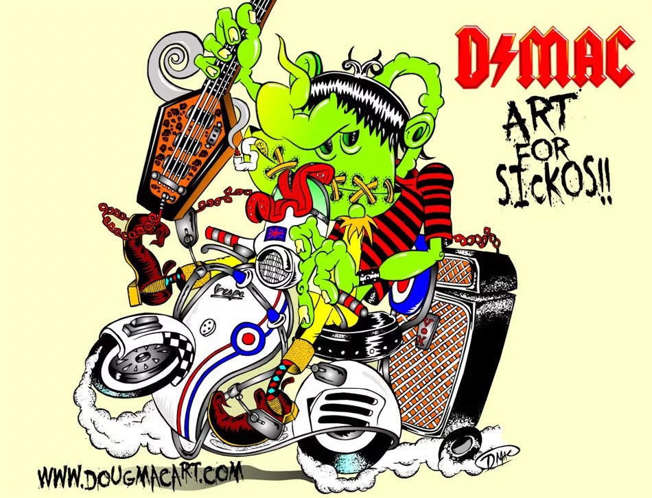 Doug Mac can thank — or blame — his old man for sending him down the road to lowbrow art littered with camp horror and hard rock. Mac divides his time between slinging bass for heavy rockers Rock ‘n’ Roll Social Club, and slinging ink that brings to life characters that are drawn mondo bizarro and over the top. He has illustrated covers for The Village Voice, designed and drawn the posters for the upcoming custom-van documentary “Vannin'” and the Monsters of Rock Tour, created roughly 40 to 50 CD covers, and produced artwork for anyone who digs hot rods, zombies, mayhem, explosions, and boobs the size of Volkswagens.